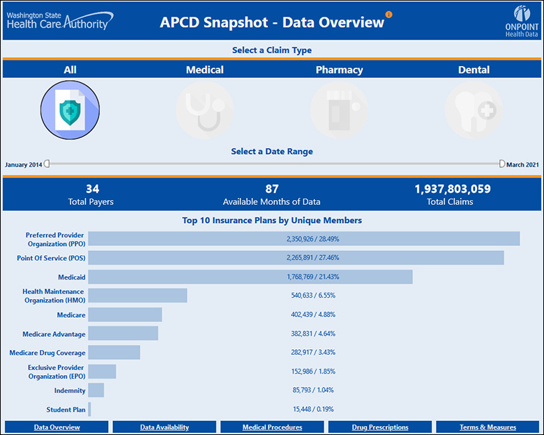 The APCD Snapshot was deployed most recently in Washington State and features views such as “Data Overview,” “Data Availability,” “Medical Procedures,” and “Drug Prescriptions,” providing summary-level data and adhering to appropriate privacy and security safeguards.