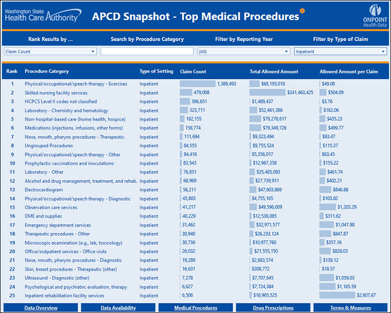 Figure 2. APCD Snapshot’s “Medical Procedures” View Example (Sorted by Claim Volume for Inpatient Claims)